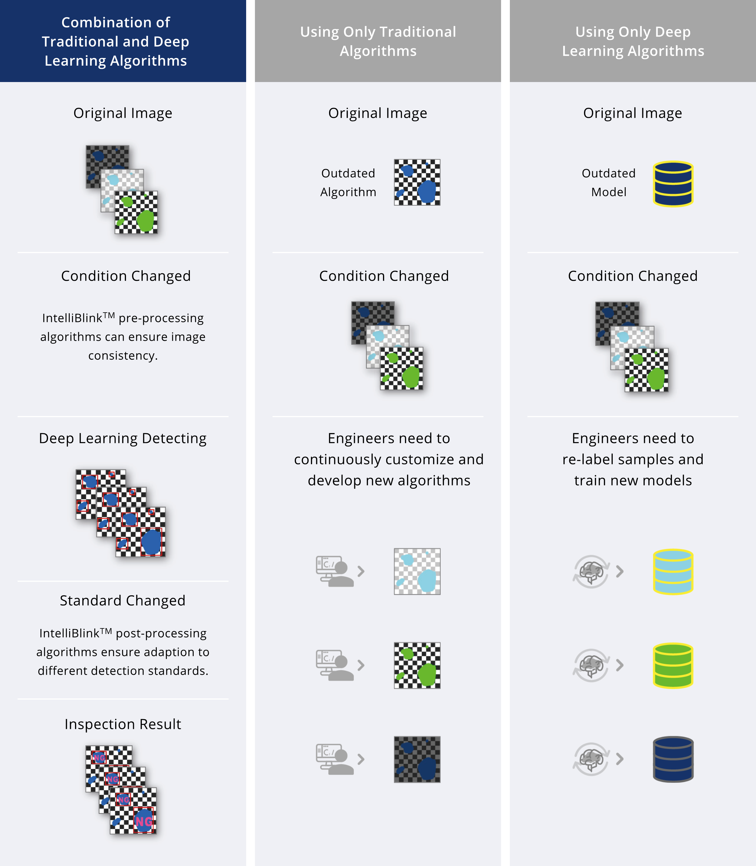 IntelliBlink-AI strengthens the integration of deep learning and traditional vision algorithms, establishing a smooth data path. Without extensive sample collection and annotation, it can quickly adapt to changing detection standards and occasional detection issues. It eliminates the need for long-term custom development, reducing research and development costs while improving the cost-effectiveness of products.